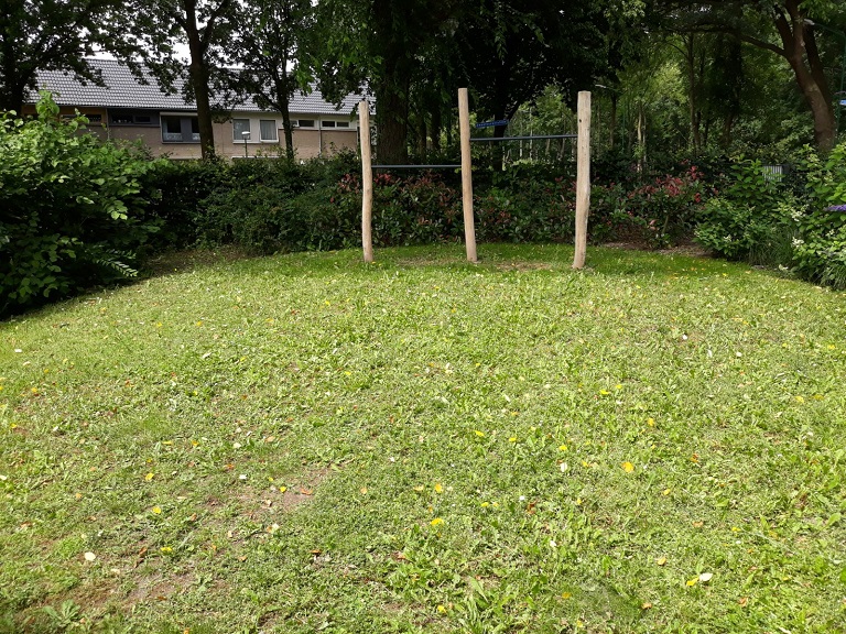 - Groot, natuurlijk aangelegd buitenterrein met een zandheuvel, glijbanen, zandbakken, een speelhuisje, duikelstangen, struiken en grote bomen.