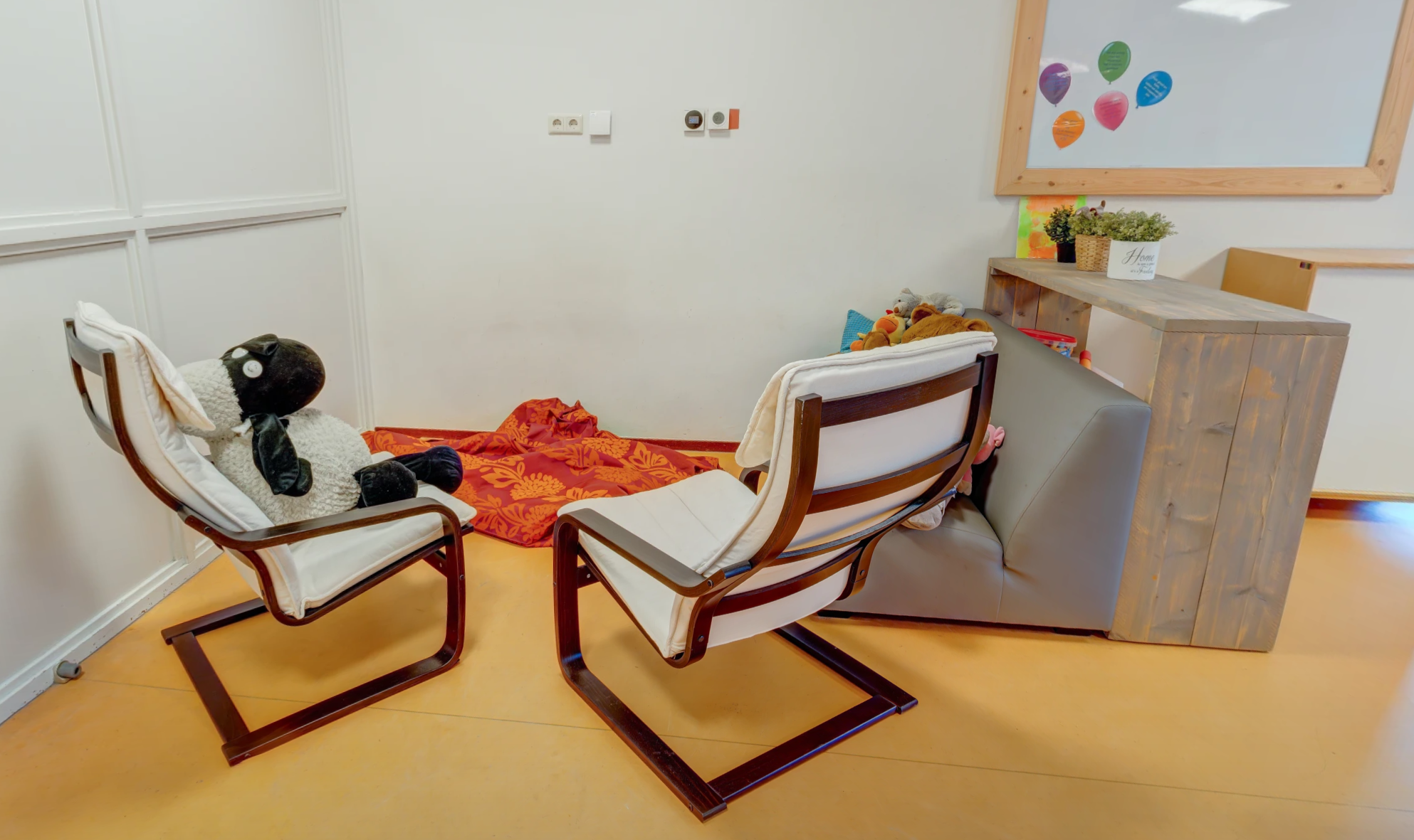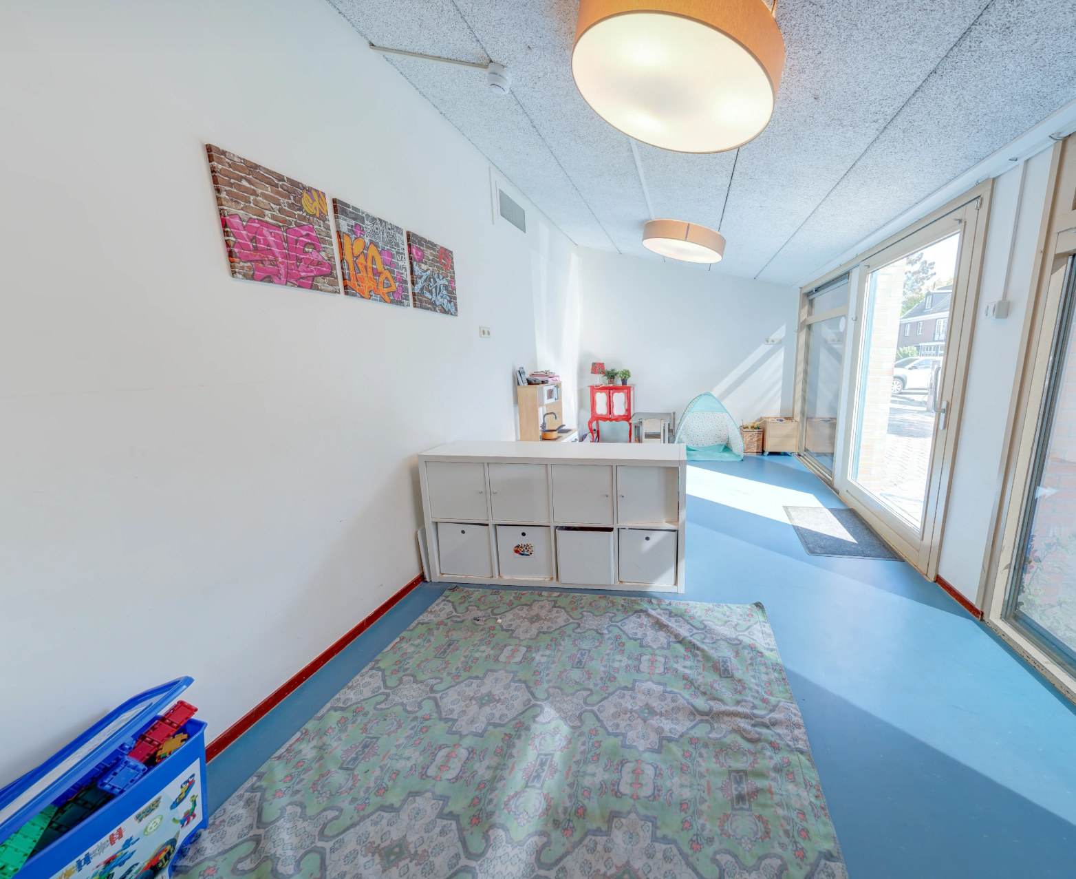 - Aparte buitenruimte waar de kinderen zich kunnen uitleven, met picknicktafel, zandbak en krijtborden.