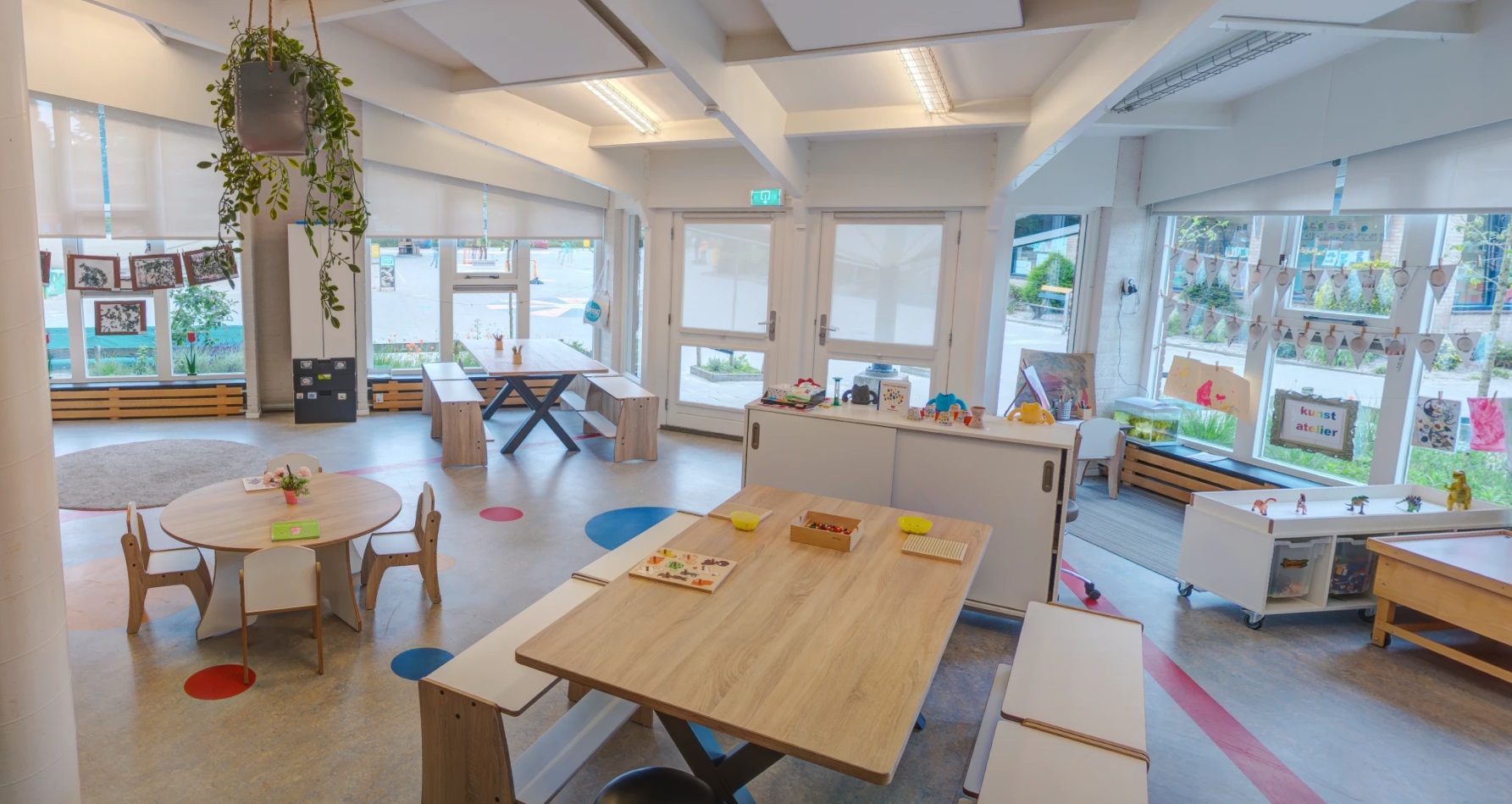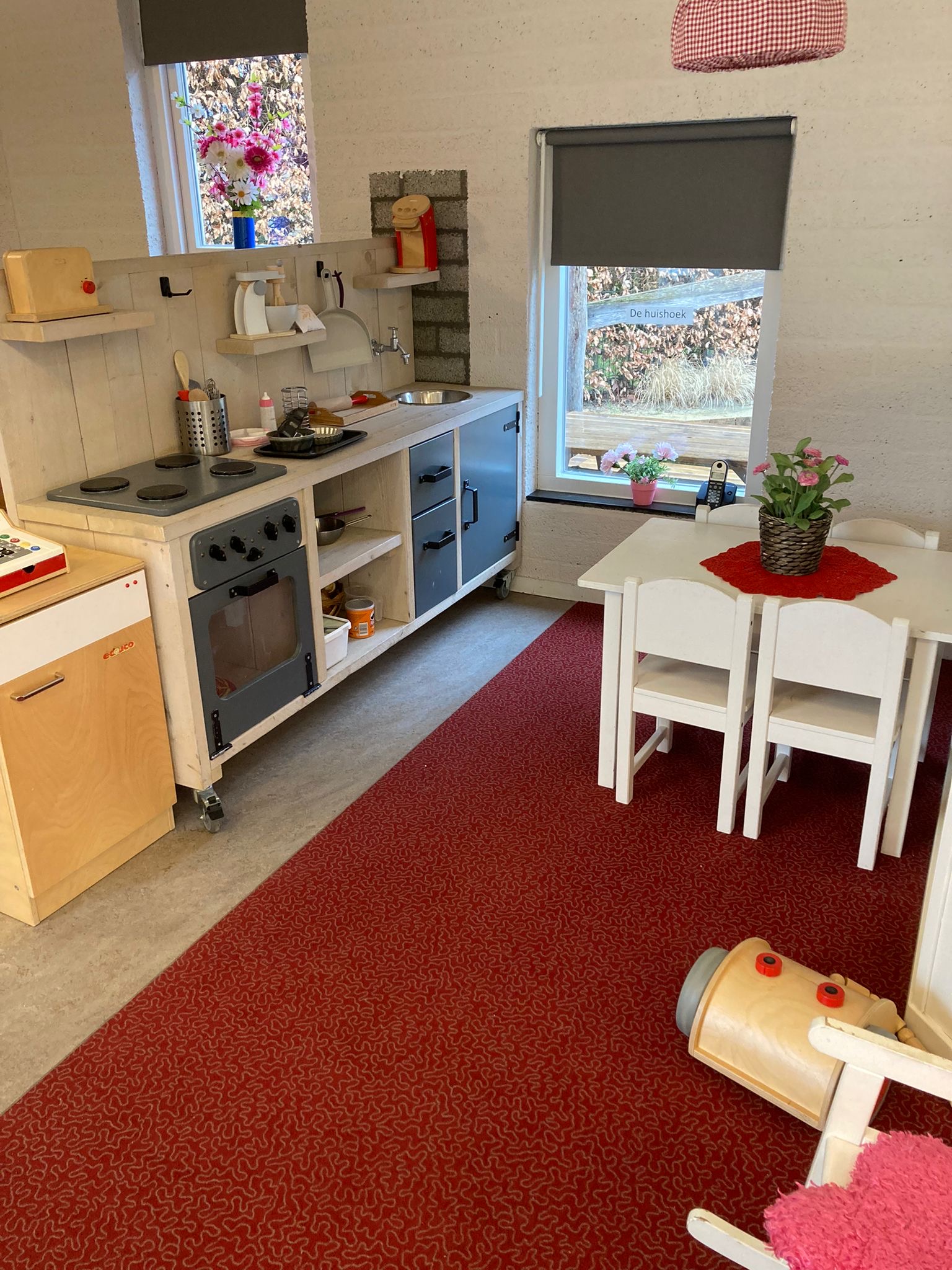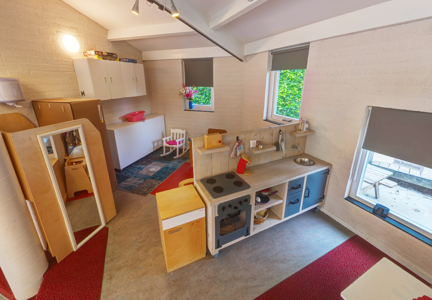 - Uitdagende ruimte met o.a. een huishoek, een bouwhoek, een chill-hoek, make-up hoek, een knutselhoek en tal van leuke materialen.