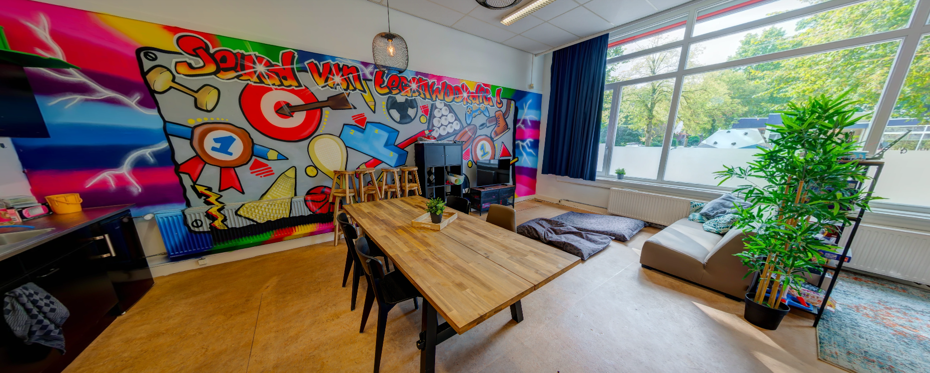 - Meerdere ruimtes waar kinderen allerlei activiteiten kunnen doen, maar ook even bij kunnen tanken na een drukke schooldag. Zoals een kunst- en cultuurhal, een boomhut in de groep, een ontdektuin voor de jongste bso'ers en in school o.a. een kookatelier en gymzaal.