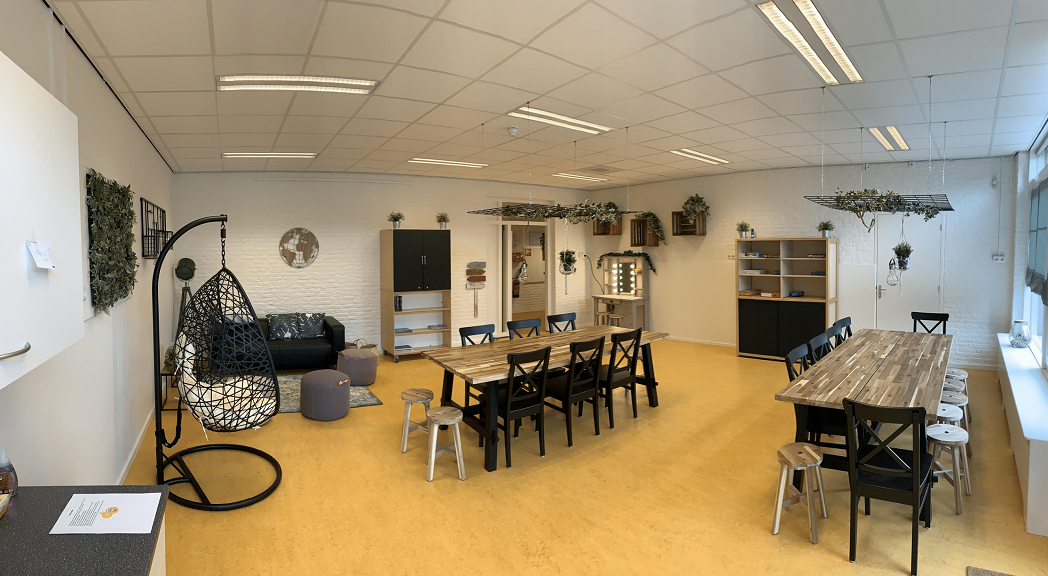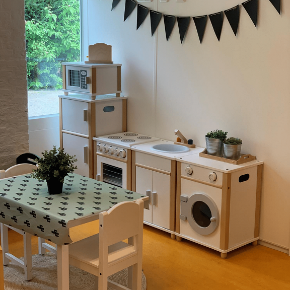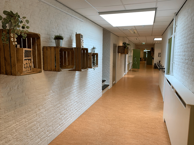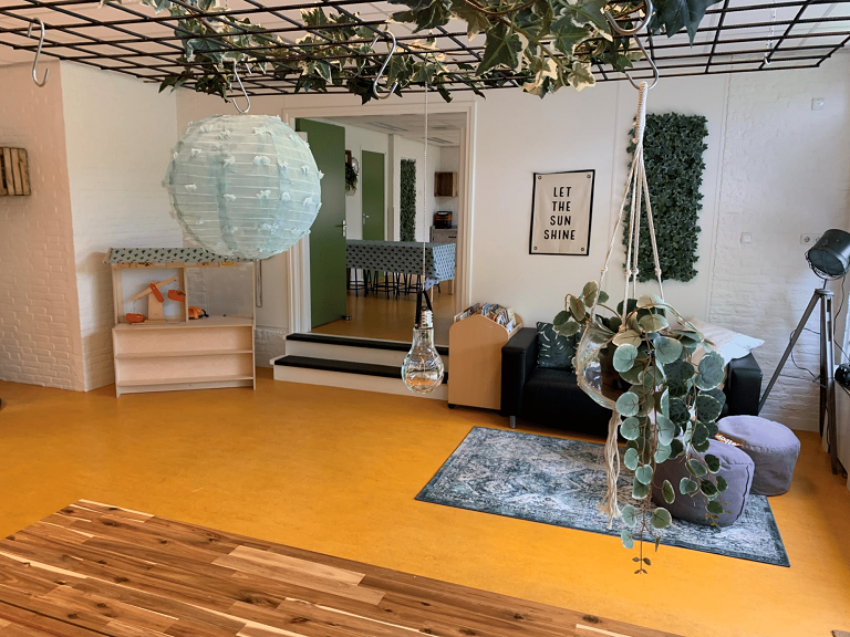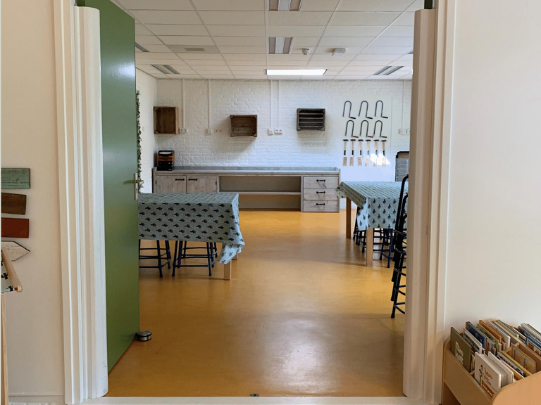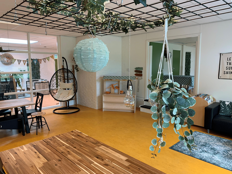 - De kinderen kunnen spelen in diverse ruimtes, waaronder een knutselruimte, speelhal, bouwhoek, huishoek en turnhoek.