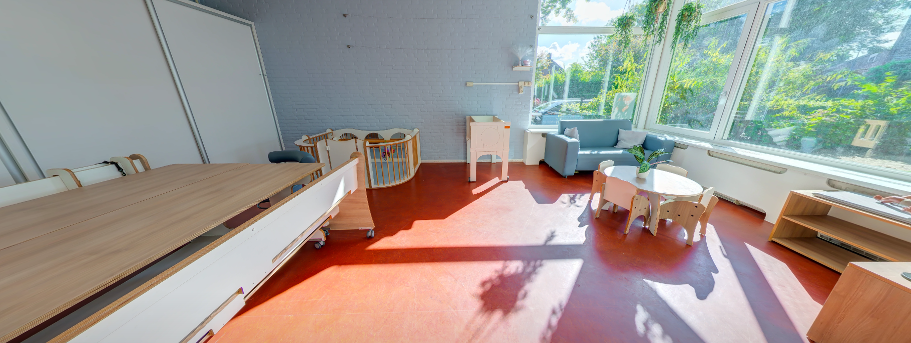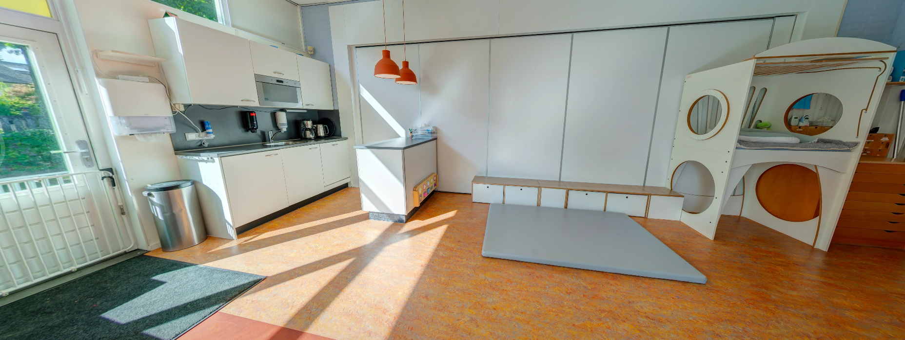 - Door schuifwand tussen de groepen kan één grote ruimte worden gecreëerd voor gezamenlijke activiteiten.