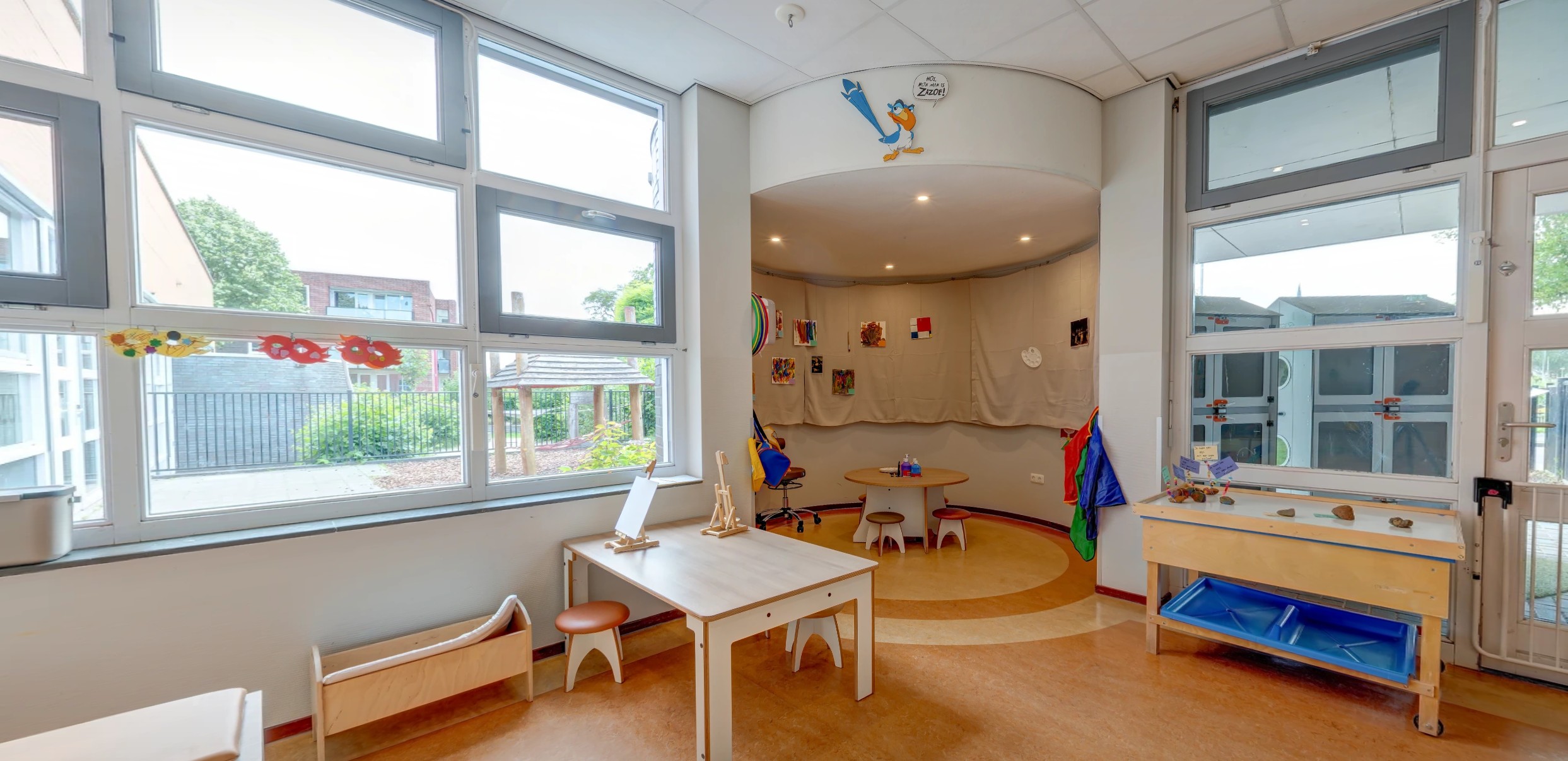 - Een eigen buitenspeelplaats waar samen met de peuters van groep Simba van dagopvang Zazoe heerlijk buiten gespeeld kan worden. Ook op de speelplaats van de basisschool mogen de kinderen spelen.