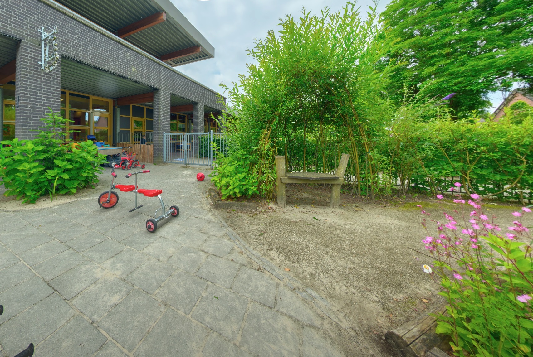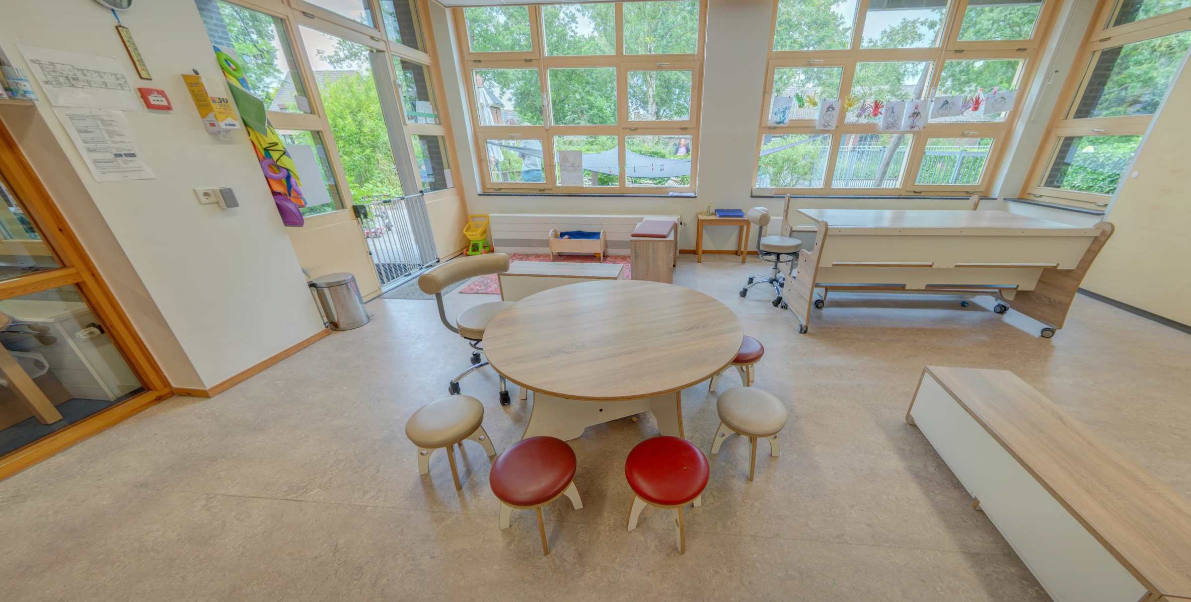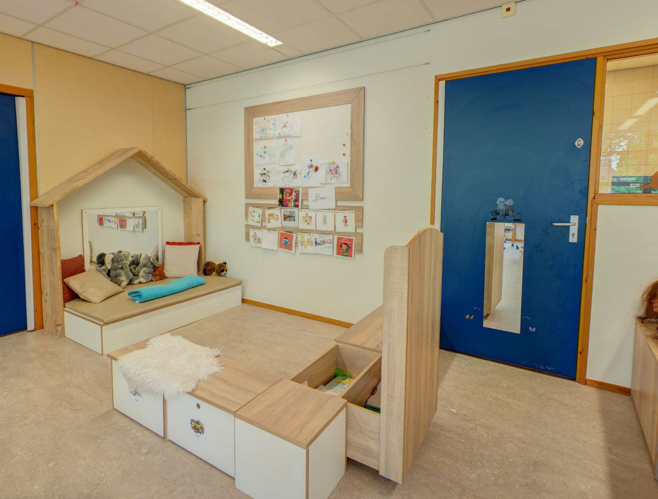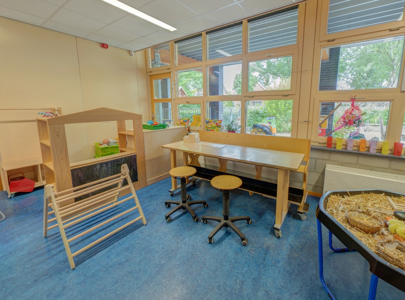 - Gezellige groepsruimte met verschillende speelhoeken en een afgeschermde buitenspeelplaats.