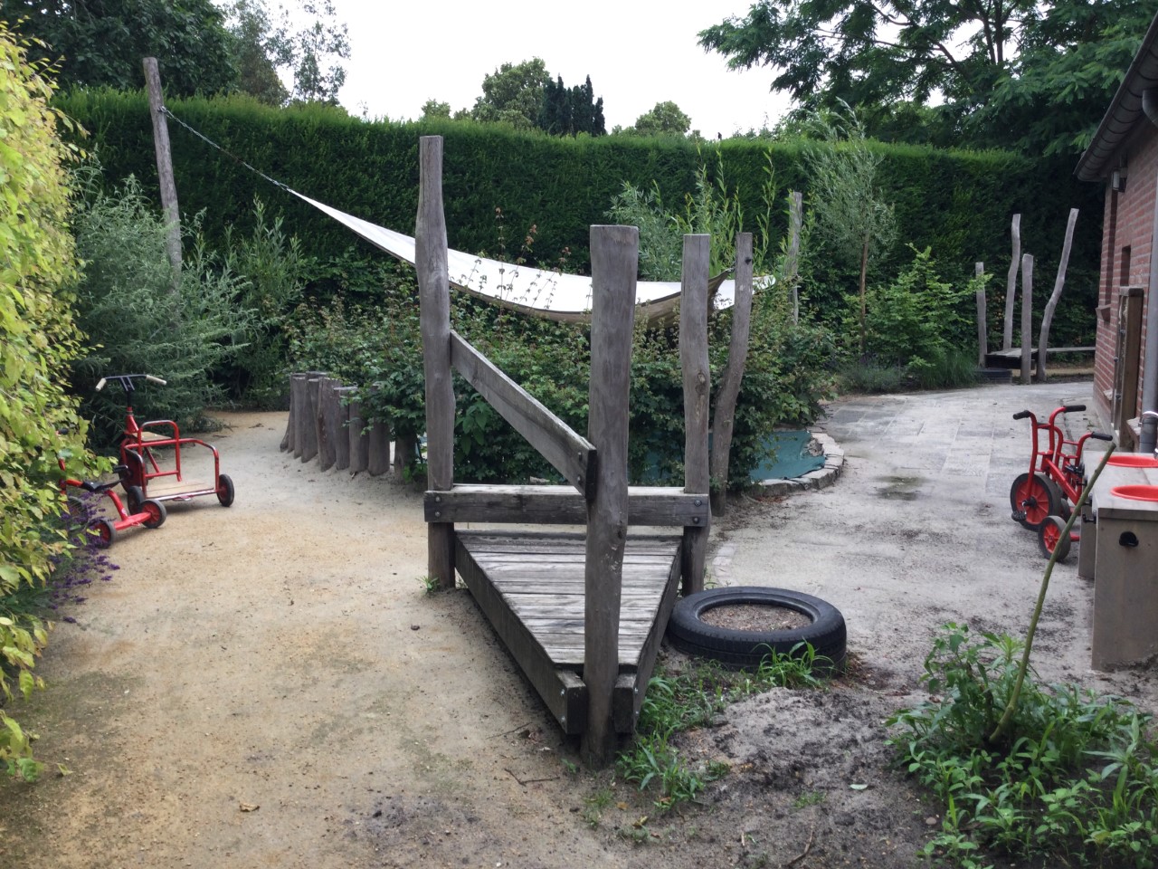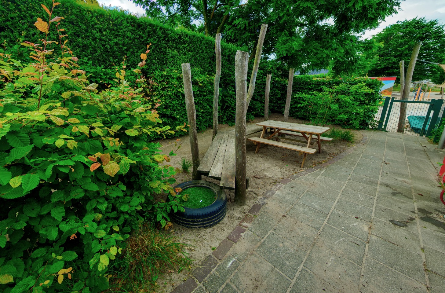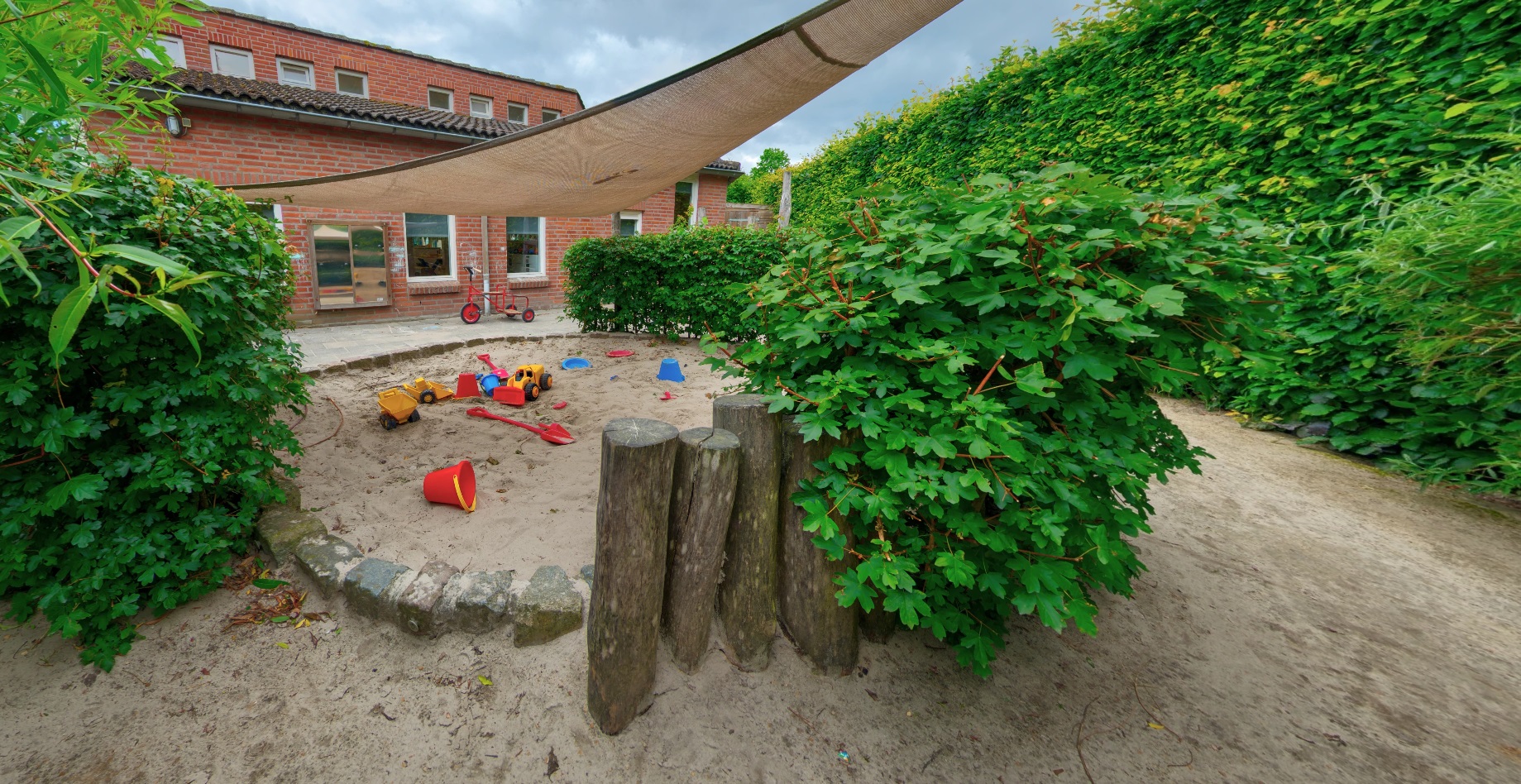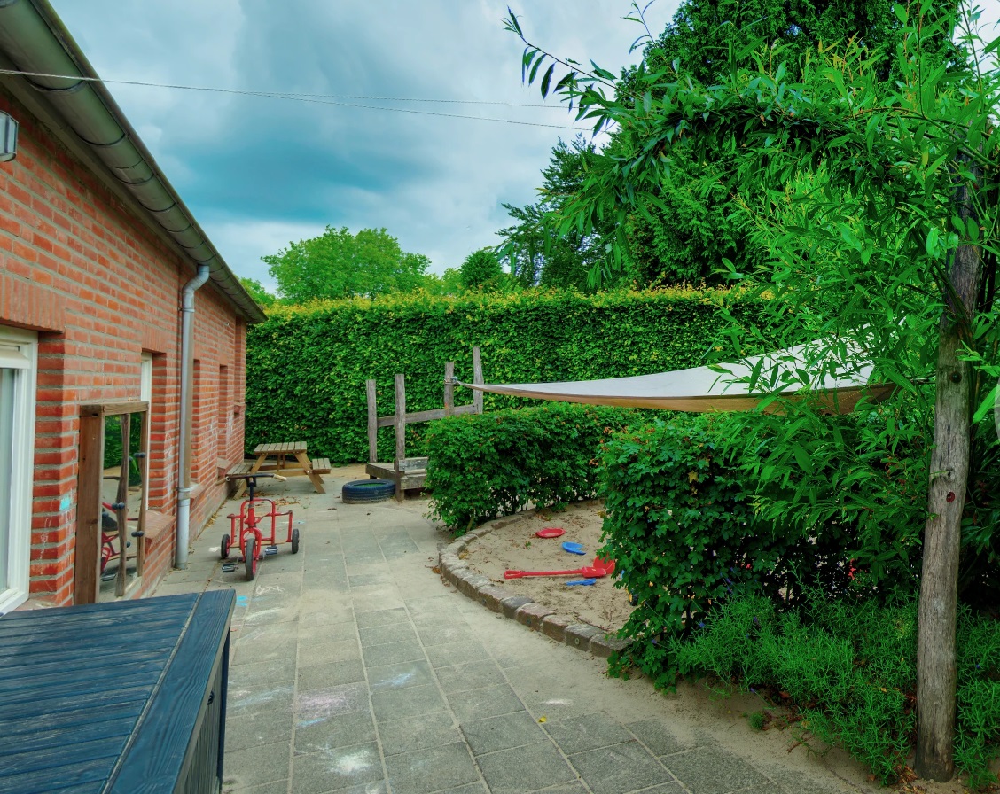 - Gezellige groepsruimte met verschillende speelhoeken en een afgeschermde buitenspeelplaats.