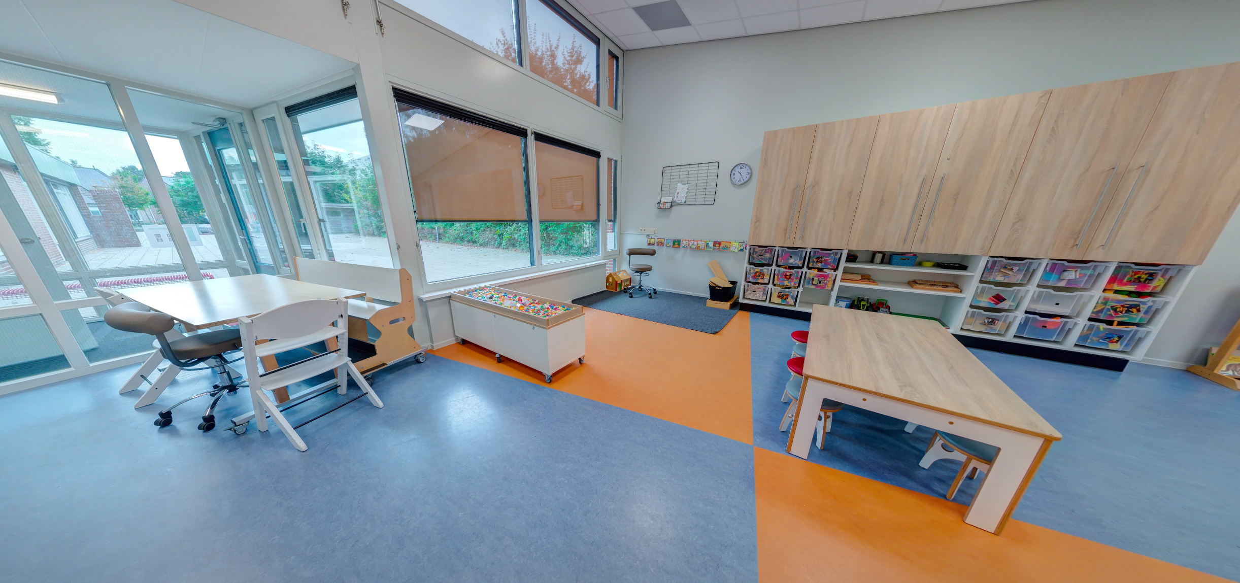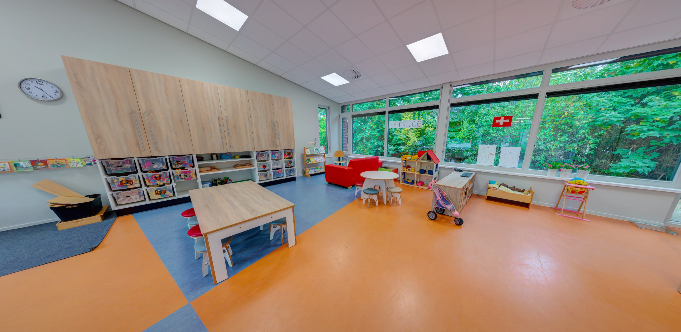 - Gezellige groepsruimte met verschillende speelhoeken. De peuter- en kleuterruimtes zijn van elkaar gescheiden door middel van een schuifdeur. Ze ontmoeten elkaar vaak; een goede voorbereiding voor de peuters op de basisschool.