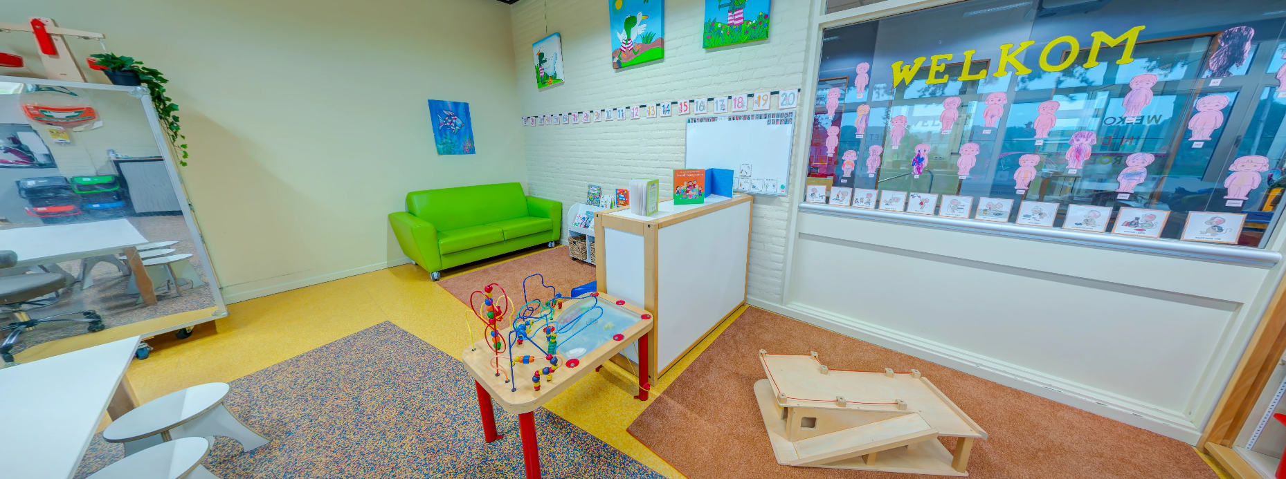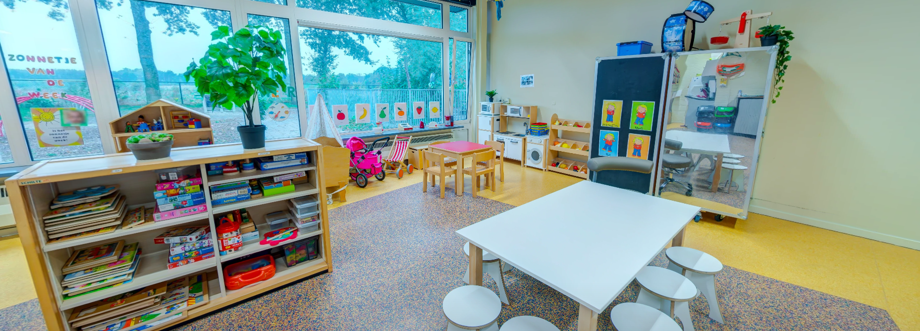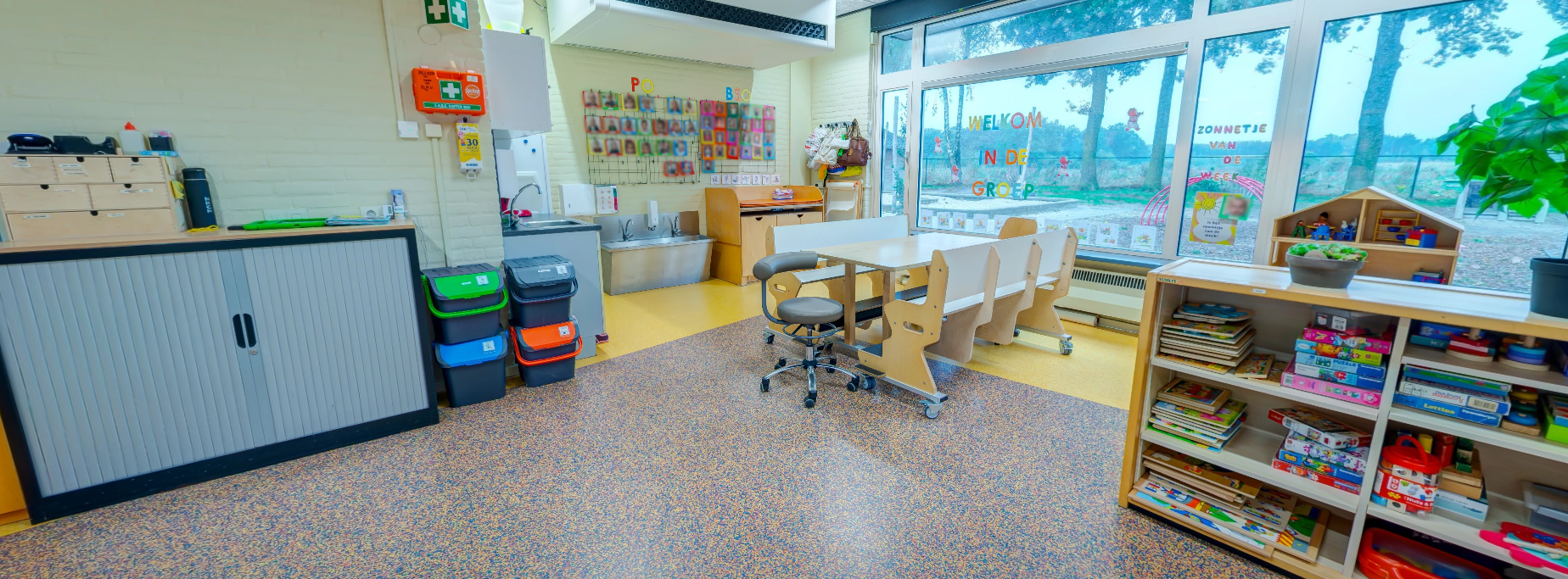 - Groepsruimte met verschillende speelhoeken, afgeschermde buitenspeelplaats én de beschikking over de faciliteiten van de andere partners in het gebouw.